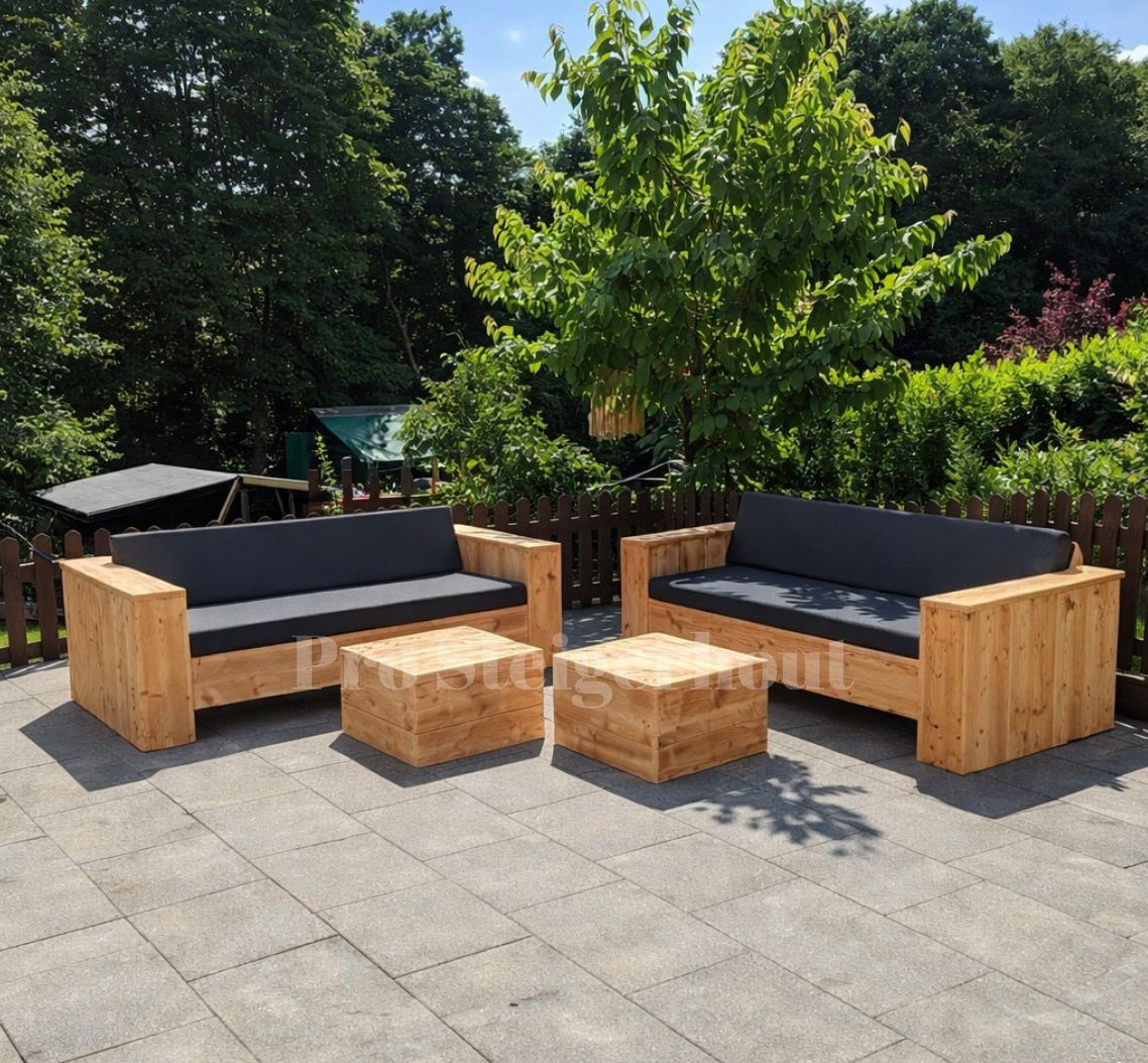 Onze douglashouten loungesets combineren comfort, uitstraling en maatwerk in één. Of je nu kiest voor een losse loungebank, een set met twee banken of een combinatie met loungebanken én loungestoelen– bij ons stel je jouw ideale set helemaal zelf samen.